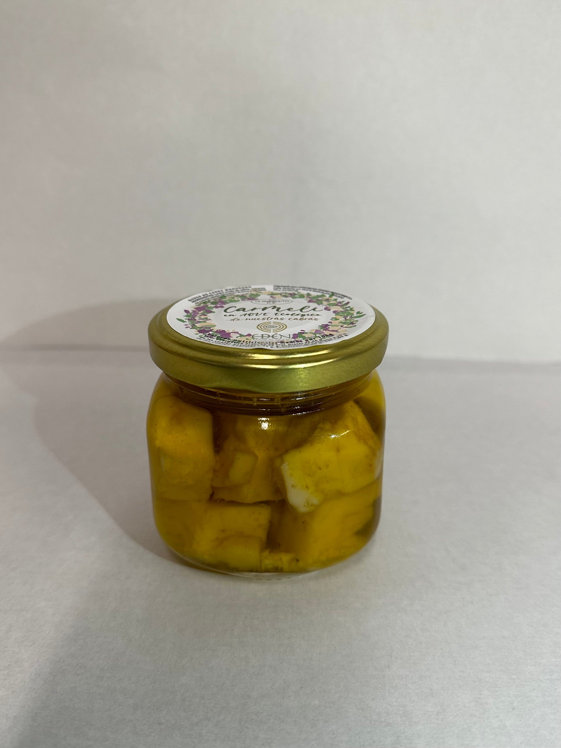 Bote con queso de cabra madurado más de un año, 80 gr y 110 gr de aceite de oliva virgen extra ecológico